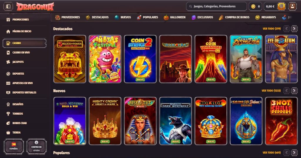 El catálogo de juegos de casino Dragonia incluye más de 3,000 títulos de 110 proveedores diferentes. Esto significa que no importa qué tipo de juego os guste, probablemente lo encontraréis aquí. La librería se actualiza constantemente con lanzamientos nuevos, así que siempre hay algo fresco para probar.