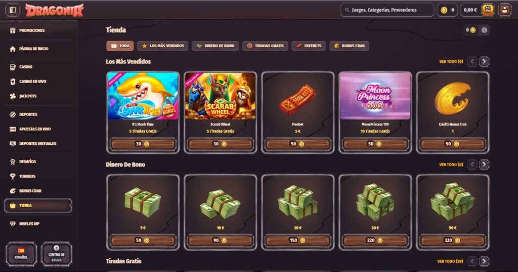 Con las monedas acumuladas podéis comprar bonos de recarga, paquetes de tiradas gratis para slots específicos, fichas para apuestas deportivas (freebets) y créditos para el Bonus Crab. Algunas ofertas especiales aparecen temporalmente en la tienda, como entradas a torneos VIP o cashback mejorado.