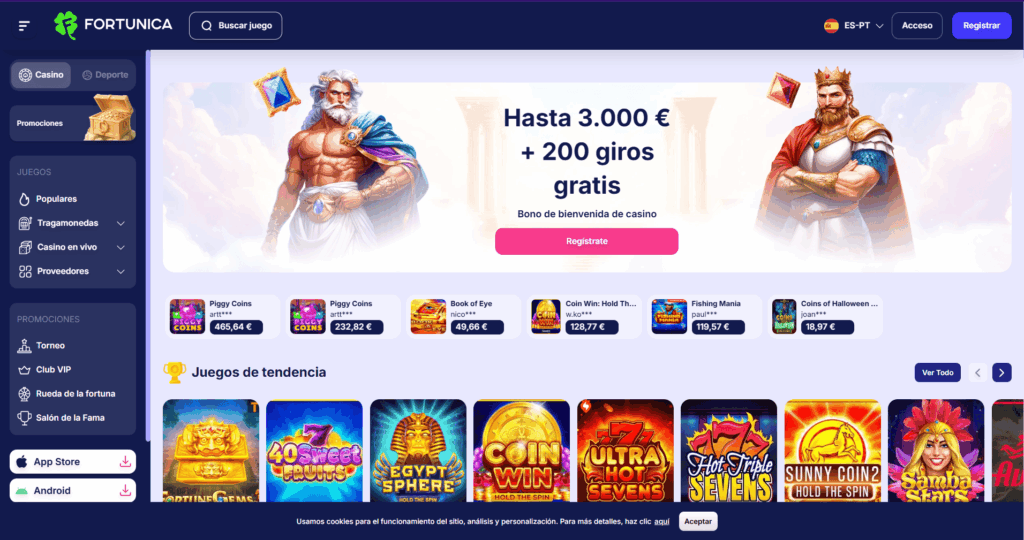 Fortunica es un sitio relativamente nuevo que combina casino online y apuestas deportivas en un mismo lugar. Lanzado en 2025, está orientado a jugadores que buscan variedad: desde slots y juegos en vivo hasta eSports y fútbol. Acepta tanto euros como criptomonedas, lo que amplía las opciones de pago.