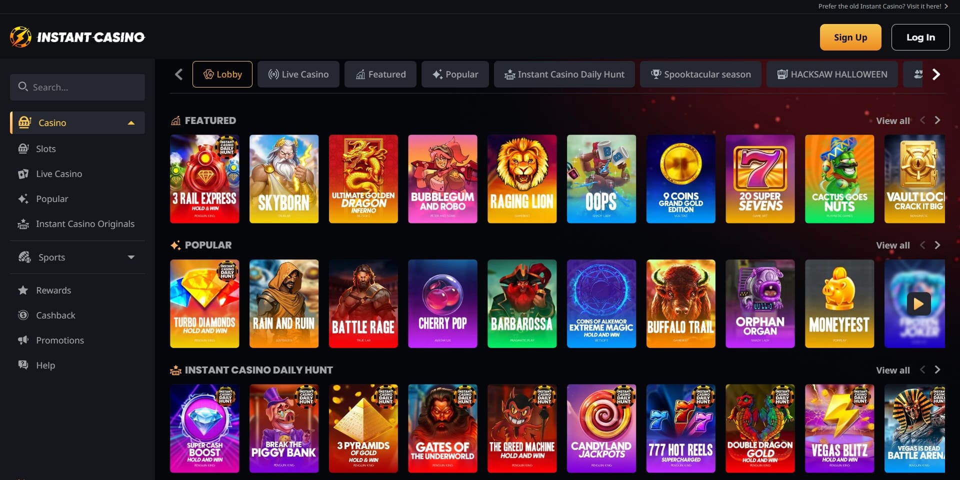 Los juegos de casino Instant incluyen más de 3,000 títulos de 117 proveedores diferentes. La biblioteca combina slots clásicos, video slots modernos, juegos de mesa, casino en vivo y juegos especiales. Todos los juegos funcionan en la versión web adaptativa, lo que significa que puedes jugar desde cualquier dispositivo sin descargar nada.