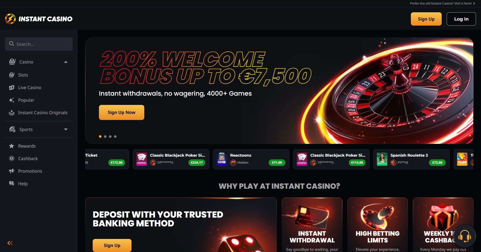 Instant Casino llegó al mercado en 2024 y ya se ha ganado un lugar entre los favoritos de los jugadores europeos. Este casino online ofrece más de 117 proveedores de juegos, apuestas deportivas en vivo y criptomonedas como método de pago. Con licencia de Anjouan Gaming (Comoras) y operado por Simba N.V., Instant combina una amplia selección de entretenimiento con bonos generosos.
