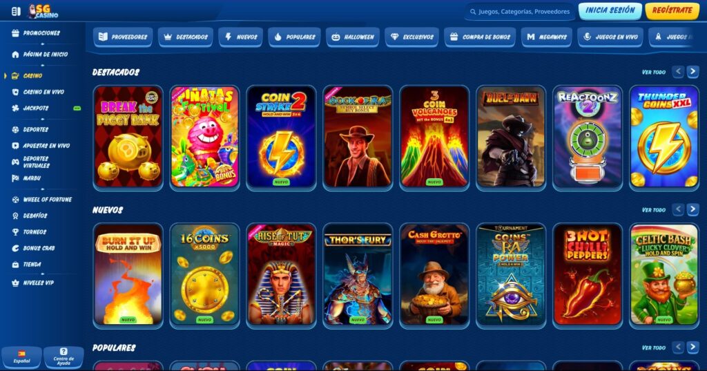 Los juegos de casino SGcasino provienen de unos 80 proveedores. Esto significa variedad real, desde clásicos hasta lanzamientos recientes. Las categorías incluyen slots, casino en vivo, juegos de mesa, jackpots y crash games.